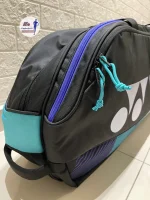 The Yonex Pro Tournament Bag (BAG2401W) is a premium rectangular kit bag designed for professional and club players. It features two spacious main compartments capable of holding up to 6 rackets, apparel, and shuttlecocks. The bag includes a dedicated shoe pocket to keep gear organized and dual carry handles for easy transport. Its durable construction and sleek black design with teal/blue accents make it a stylish choice for tournament travel.